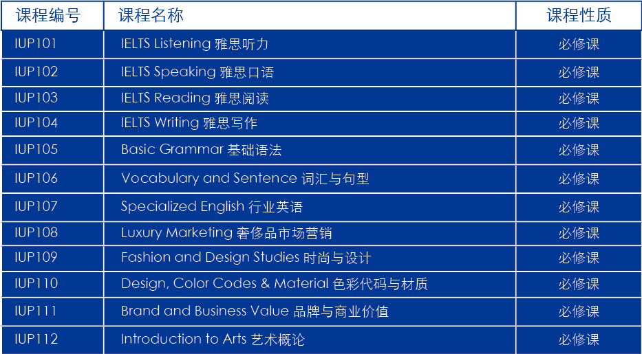 核心专业课程:雅思听力、雅思口语、雅思阅读、雅思写作、基础语法、词汇与句型、行业英语、奢侈品市场营销、时尚与设计、色彩代码与材质、品牌与商业价值、艺术概论