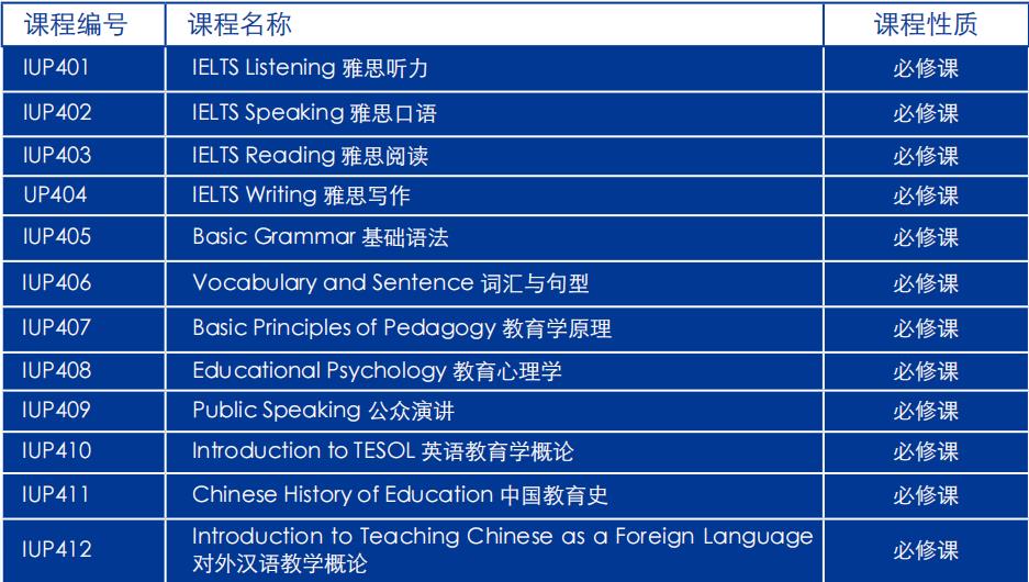核心课程: 雅思听力、雅思口语、雅思阅读、雅思写作、基础语法、词汇与句型、行业英语、教育心理学、公众演讲、英语教育概论、中国教育史、对外汉语教学概论